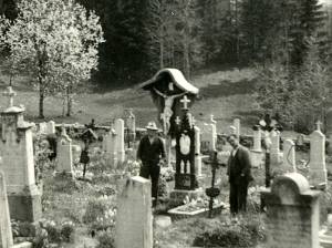 Ne vem, kakšna priložnost je bila ob nastanku te fotografije. Ni bilo še v navadi fotografiranje pogrebov, to se je pojavilo kake tri ali štiri leta pozneje. Mogoče je vendarle v zvezi z gomilo v ospredju ali grobom, ob katerem stojita možaka. Ali pa je Lojze Tomec zaslutil, da se bo celo na pokopališčih začelo prav kmalu vse viharno spreminjati in je napravil posnetek za današnje čase – mogoče pa zgolj iz navdušenja nad idiličnim pomladnim prizorom, kot povabilo k meditaciji in sprostitvi … Hm, me je malo zaneslo, oprostite.