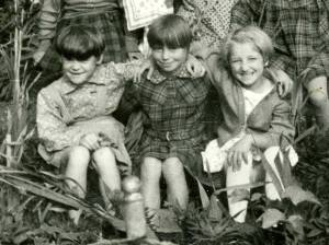 Fotografija je nastala ob eni taki priložnosti, ko so se veliki in majhni otroci v nedeljo popoldne igrali pred Srnelovo hišo. Tam je bila pod kozolcem velika gujsanca in tam so bila doma že večja dekleta, Milena in Iva, ki sta že imeli gramofon in, jasno, tudi najrazličnejše gramofonske plošče. Predvsem je bil tedaj nadvse popularen Slak. Po vasi je največkrat na ves glas odmevala njihova pesem “Kadar pa mim hišce grem” in “Med cvetlicami po Logu”. Nas, malo mlajše, sta Milena in Iva, pa seveda tudi naša Boti, ob takih priložnostih učile in tudi naučile plesati. Na vaških veselicah, ponavadi je bila velika veselica ob žegnanju, smo odraščajoče deklice tako že lahko preizkusile svoje plesne veščine.