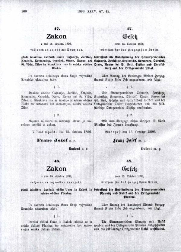 Zakon z dne 15. oktobra 1896 veljaven za vojvodino Kranjsko, glede izločitve davčnih občin Cajnarje, Jeršiče, Krajnče, Kremenca, Osredek, Otave, Ravne pri Št. Vidu, Žilce in Štruklova vas iz selske občine Bloke.