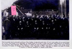 Deželnozborni poslanci Slovenske ljudske stranke so se verjetno po slovesni maši zbrali pred cerkvijo v Trnovem, kjer je bila posneta fotografija.To sklepam po njihovih pražnjih oblekah, po podobi prednje strani cerkve in po pogledu na Golovec. Sploh je bila ta cerkev, ki ima zadaj lep vrt , tam pa je sedaj tudi v muzej spremenjena hiša Jožeta Plečnika, zbirališče katoliških izobražencev (to je še danes).Tu je med vojnama služboval Fran Saleški Finžgar in so se tudi pri njem zbirali takratni kulturniki.