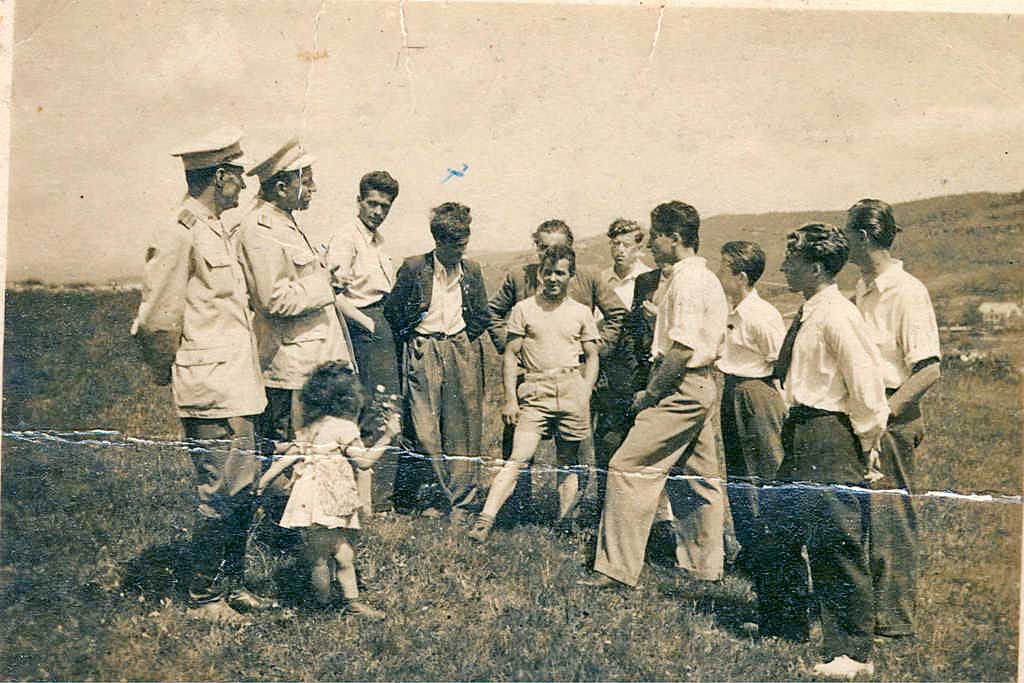 Predvojaške vzgoje so bili po drugi svetovni vojni deležni vsi fantje – vojaški obvezniki in so se je morali udeležiti, še preden so jih vpoklicali v JLA. Tale je potekala v sproščenem vzdušju. Fantje so dobre volje, oficirja prav tako, klepet je sproščen. Ljubko dekletce z rožicami je za popestritev.