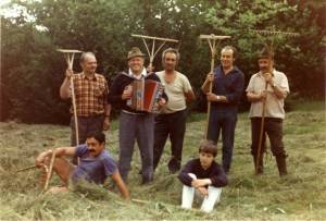Poleti 1983, Cvirglov laz. Veselo razpoloženi lovci Lovske družine Rakek so se po uspešno opravljeni košnji, preden so se lotili sušenja sena za zimsko prehrano divjadi, postavili pred fotografski objektiv.