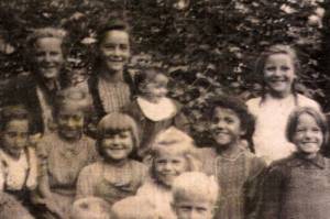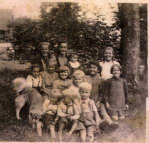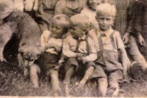 Nasmejani otroci so slikani sredi vojne vihre, poleti 1944, ob macesnu na meji med Turkovim in Kotovčkovim vrtom v Bezuljaku.
