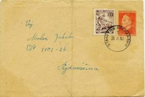 Na rumenkasti ovojnici, naslovljeni na mojega očeta, je poštni žig z datumom oddaje 26. november 1953. Dolgo je že od tedaj. Še način, kako je izpisan naslov prejemnika, je zgodovina: Voj. pomeni “vojnik” in ne vojak, kajti v JLA je bil uradni jezik srbohrvaščina in ne slovenščina kot v avstro-ogrski, kjer so tudi pri poveljevanju v vojski menda tolerirali nacionalne jezike. V. P. 1101-26 je številka vojne pošte – tudi če se je enota premaknila, je naslov veljal. Ajdovščina, kjer je bil oče takrat nastanjen v kasarni, kolikor ni bil na “vatrenom položaju“, kot vsi drugi kraji še ni imela poštne številke, zadostovalo je ime.