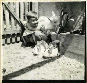 Čas nastanka slike je izmišljen, neznan je tudi kraj, prav tako ne vem za ime nasmejanega fantka na sliki. Morda bo kdo kaj napisal o tem. A za ta prispevek to ni bistveno. Bistven je občutek topline, prijateljstva med zajčkoma, kozličkom in fantkom. Slika izžareva občutek, da so vsi živa bitja, ki živijo skupaj v razumevanju, sočutju, si delijo veselje nad življenjem. Tako kot je bilo nekoč na kmetijah, ko so bili voli, krave, konji, prašiči malodane družinski člani s svojimi imeni in zanesljivo pripadnostjo hiši. Da ne govorimo o psu, ki je menda edino živo bitje, sposobno zvestobe do groba.