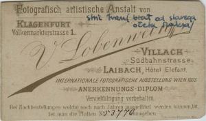 Na sliki je Ivan (tudi Janez), sin mojega prapradeda Andreja z Unca, brat mojega pradeda Maksa in stric mojega deda Janeza. Zabeležke na hrbtni strani je zapisal moj oče Marjan. Bilo je pred leti, ko nama je ded pokazal družinske fotografije, moj oče pa je po dedovem spominu zapisoval podatke. Fotografijo strica Ivana (nalepljeno na karton) je v svojem ateljeju posnel Vincenz Lobenwein, najverjetneje v Ljubljani v hotelu Slon (Hotel Elefant). Sklepam, da je fotografija nastala med leti 1880 in 1882, saj menim, da ima Ivan na njej največ petindvajset let.