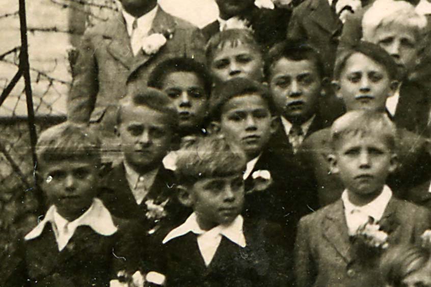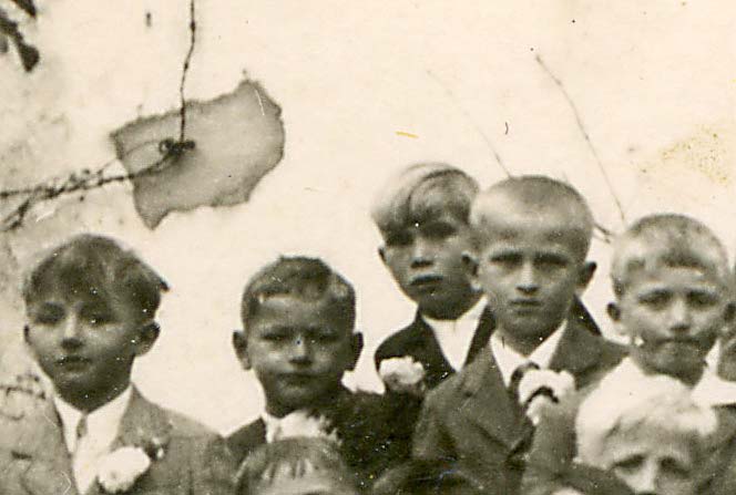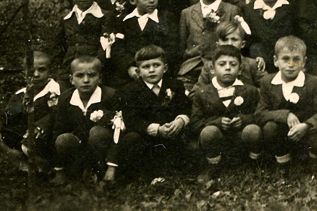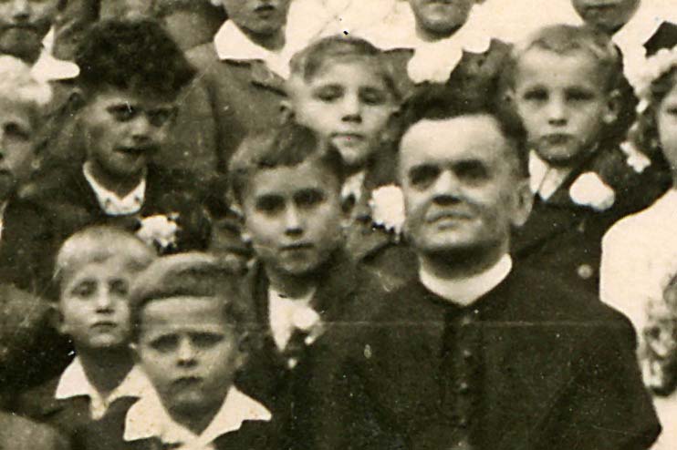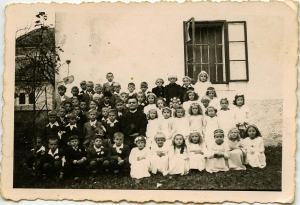 - Sredi med otroki sedi gospod Franc Hiti, vesel med svojimi veroučenci. Vesel tudi zato, ker je bilo konec vojne, ki tudi njemu ni prizanesla.
