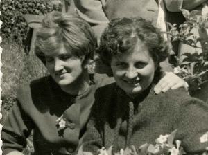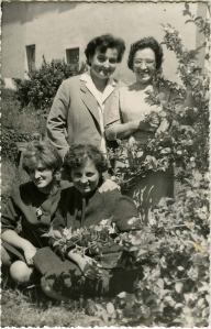 Štiri učiteljice rakovške osnovne šole so pozirale na šolskem vrtu. Tega leta sem se rodila, Tončka je bila moja soseda. Čez sedem let je bila pa še moja učiteljica. V drugem razredu nas je učila Amalija, imenovana Malči, v četrtem pa Majda. Zinka v času mojega šolanja ni več učila na Rakeku.