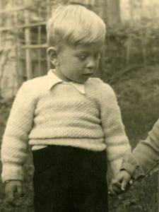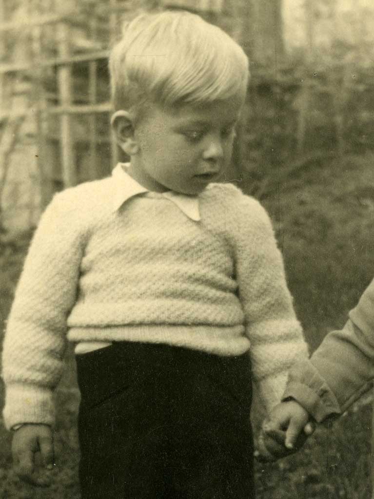 Oblečen sem v predolg pulover bele barve, ka ga je spletla moja mama. Če me spomin ne vara, je ta pulover kasneje nosila tudi moja sestra, ki je dve leti mlajša.