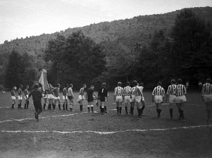 Nogometaši so se na sredini igrišča postavili v vrsto, v sredini sodnik, ob njem obe moštvi. “Zdravo, zdravo, zdravo!” zakličejo gledalcem, nato se vsa vrsta obrne, da bi pozdravila še tiste na nasprotni strani in – KLIK – na … jebelacesta! krščenmatiček! šele sedaj sem nameril in sprožil! Ma, bili ste prehitri, fantje!