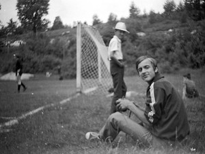 Na fotografiji je Vili Frim, s katerim sva se dogovorila, da bova to nogometno tekmo poslikala oba, strateško postavljena za eden ali drugi gol. Sklepala sva takole: če stojiš za vratarjem, igralci tečejo proti tebi in so možnosti za dober posnetek večje. Če bi stala ob strani igrišča, bi se za fotografa vse dogajalo predaleč, saj nisva imela teleobjektiva ali fotografske avtomatike, kot obstaja danes.