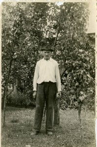Županov oče Janez Telič z Gornjega Jezera so tukaj po pripovedi njihove snahe Anice slikani eno leto po požaru, ki je razdejal vas. Fotografija pa v ničemer ne spominja na prestano hedino vaščanov, nasprotno, prav idilična je: mož se je v sadovnjaku ponosno postavil med bogato obložene mlade hruške in en sadež drži tudi v levici, kakor da ga namerava pravkar pojesti. Bela srajca namiguje, da je slika nastala neke nedelje v zgodnji jeseni, čeprav so hlače videti ponošene in čevlji se ne svetijo … Nedeljska obleka “za doma” pač, ko je kljub Gospodovemu dnevu treba poskrbeti za živino in druge tekoče zadeve … Gotovo so bili oče zadovoljni z odličnim pridelkom sadja, ki tudi sicer v blagi klimi Gornjega Jezera dobro rodi. Oče so umrli leta 1980, čez skoraj petdeset let od nastanka te fotografije, če podatek o tem drži …