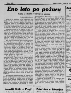 Kdo se ne spominja silne katastrofe pred letom, ko je skoro do zadnje hiše pogorela ljubka vasica Gorenje Jezero. Stisnjeno ob Cerkniško jezero in prislonjeno v breg, je vas zalotil poletnega večera strašen požar. Izmed 33 hiš jih je pogorelo 24. V vsej vasi je ostalo le še 6 celilh stavb, ker je troje hiš razpadlo.