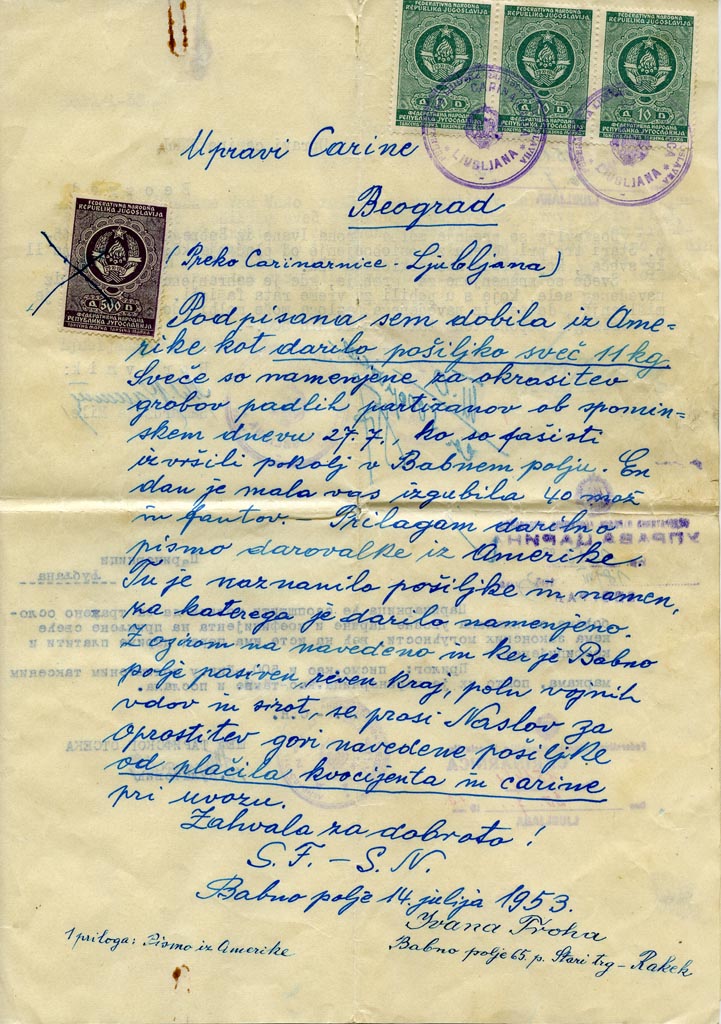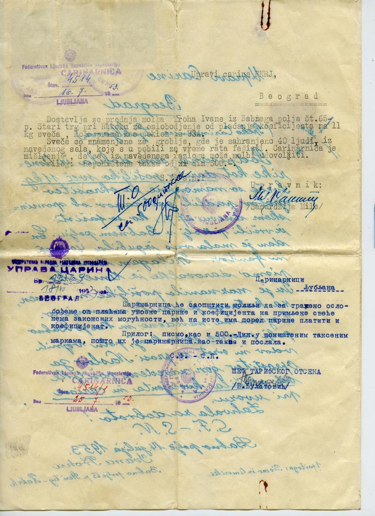Ko je pismo Reze Troha iz Clevelanda prispelo na Babno Polje, je sestra Ivana ali zanjo nekdo drug, vešč pisanja in uradnih postopkov, napisal prošnjo za oprostitev carine in koeficienta od darilne pošiljke 11 kg sveč, ki so jih poslali babnopoljski izseljenci iz Clevelanda. Prošnja je naslovljena na Carinsko upravo Beograd preko Carinarnice Ljubljana in kolkovana s štirimi koleki – trije po 10 din, ki jih je z žigom poničila Carinarnica Ljubljana in eden za 500 din, ki je samo prečrtan in ni mogoče ugotoviti, kdo ga je.