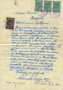 Prilog: pismo kako i 500.- din u poništenim taksenim markama, pošto ih je carinarnica kao takve i poslala.