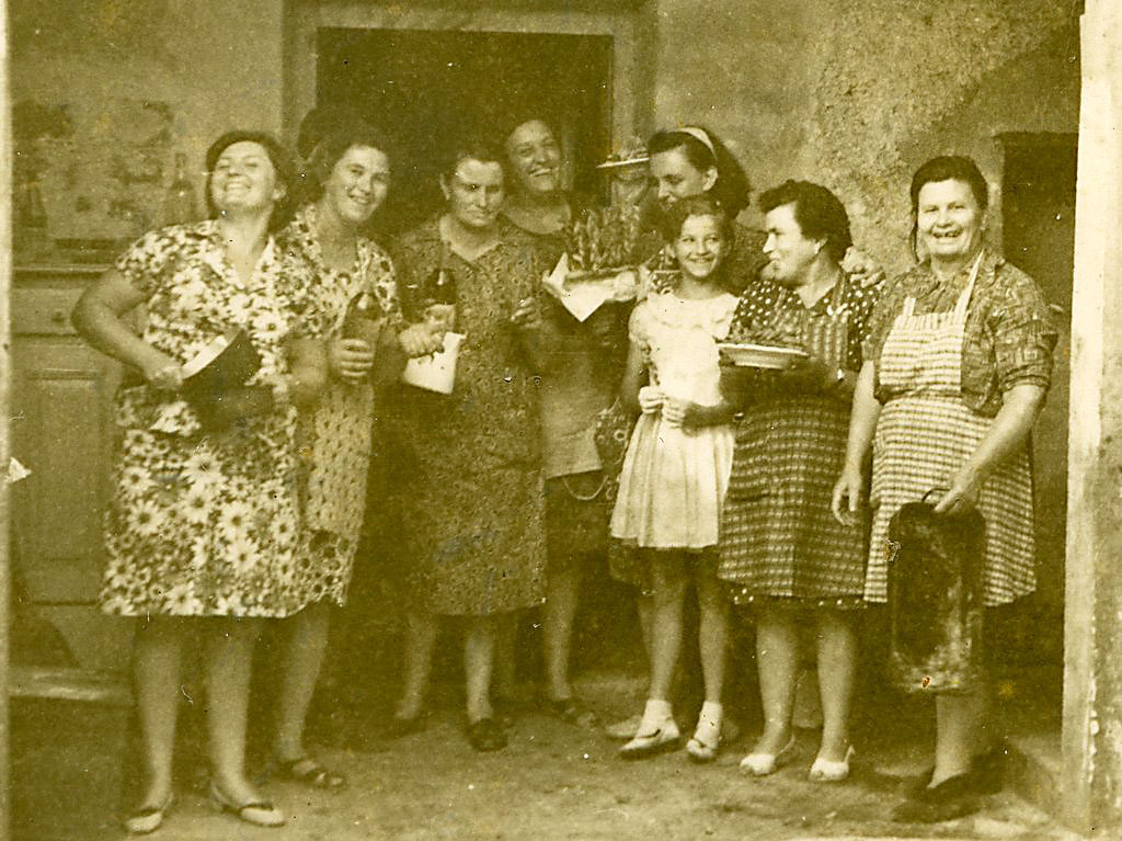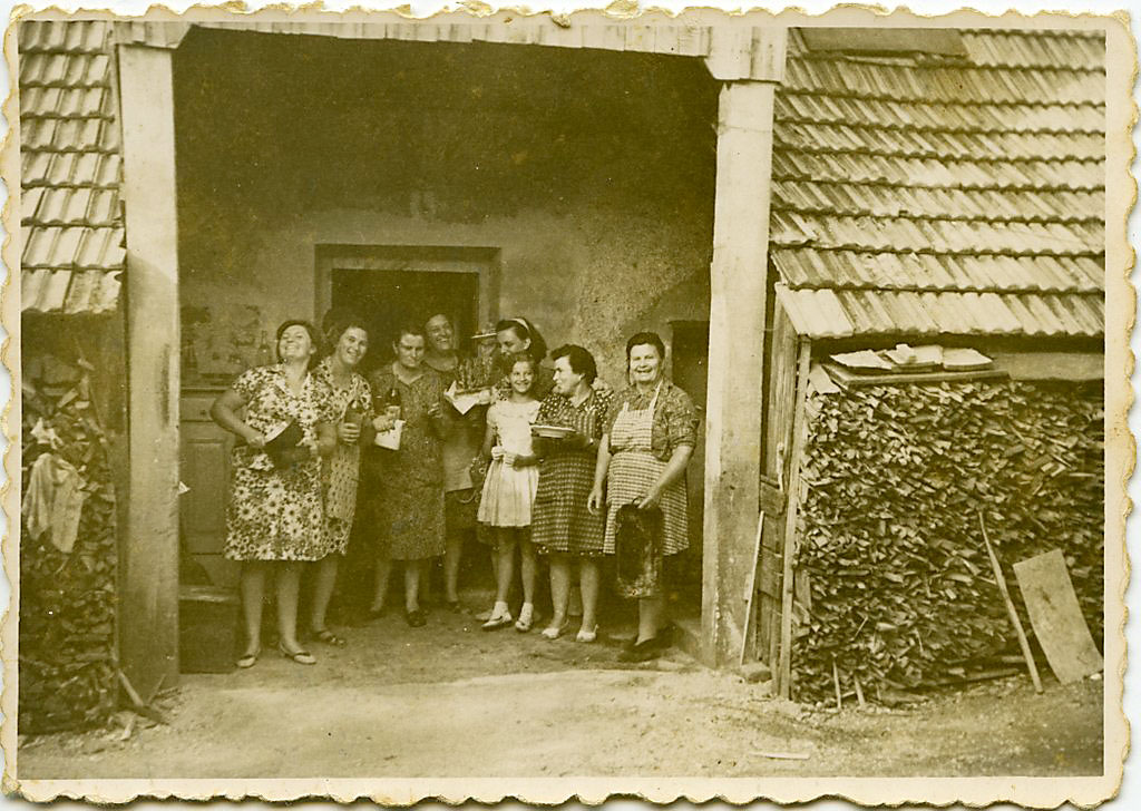 Kuhajo in pečejo za Zdravkovo in Irenino ohcet. Glavna kuharica je bila Johanca. Slikane so pri zadnjem vhodu še v stari hiši pri Tasrejdnih. Vsaka kuharica ali pomočnica drži v roki kakšen kuharski pripomoček ali izdelek ali pijačo. So dobro razpoložene, verjetno so se pri delu dobro ujele in vse lepo uspeva. V desnem kotu pri vratih je bel ajmar, na levi pa stara kuhinjska omarica, ki jo je naredil še Angelin tast.