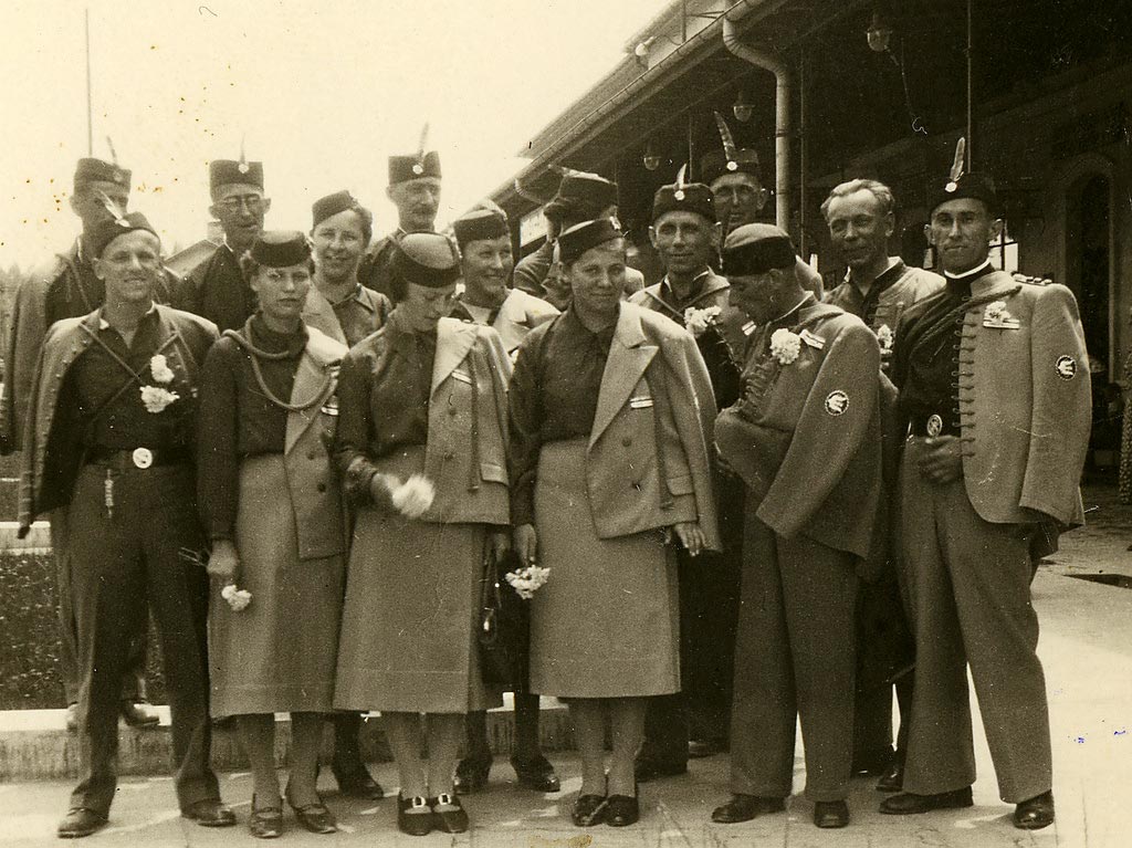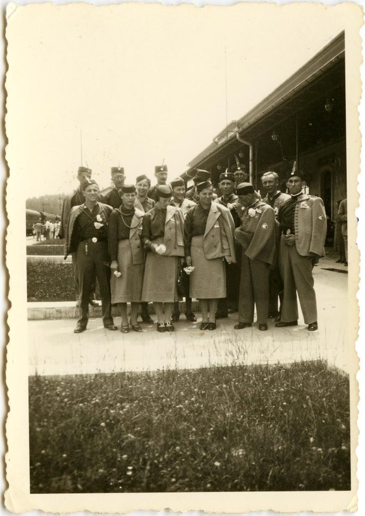 Še zadnja fotografija rakovških sokolov pred odhodom v Prago. Vlak pa že čaka. Oblečeni so v kroje, saj se bodo udeležili pomembnega dogodka.