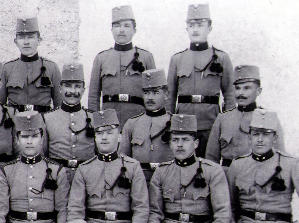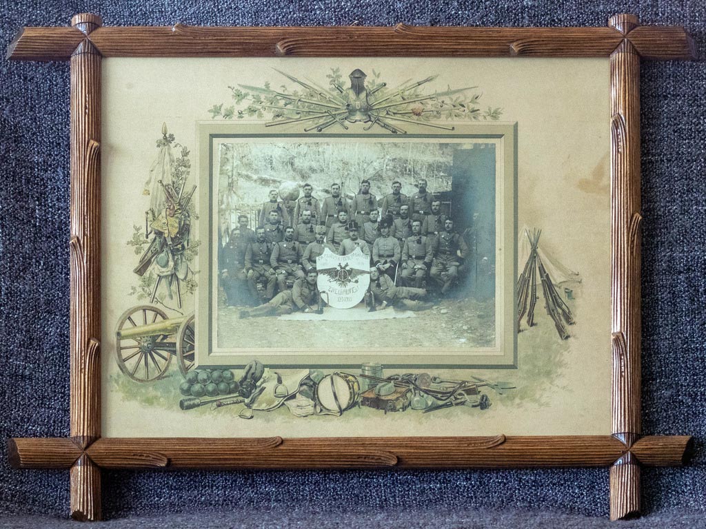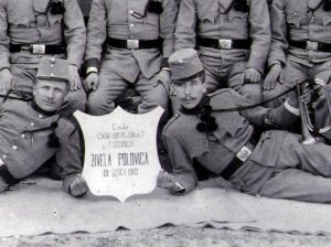 Zelo lepa in redka slika. Ne vidim, koliko zvezdic ima oficir, toda sklepam, da je poročnik ali nadporočnik. V tem primeru je to vod 7. lovskega bataljona z vojaki, ki so odslužili pol vojaškega roka. Rok je trajal tri leta. Vojaki so radi praznovali polovico roka in zadnjih 100 dni. Takrat so nastajale tudi fotografije. Trgovci so prodajali tudi razglednice za polovico odsluženega roka. V obliki stolpa, do polovice roka se pleza nanj, potem pa spušča.