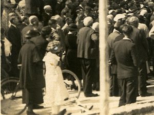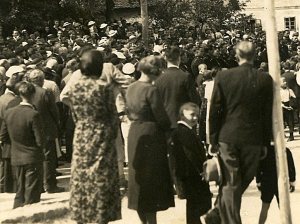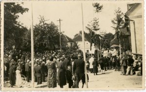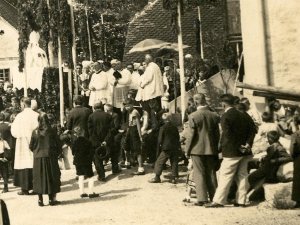 Objavili smo že dve sliki posvetitve temeljnega kamna. Na eni je videti jugozahodno stran cerkve, na drugi pa južno. Na pričujoči sliki cerkve ni videti, ker je fotograf stal pred njo. Slikal je zbrane vernike z Rakeka in okoliških krajev, ki so se udeležili svečanega dogodka. Čez dve leti – 30. oktobra 1938 – se je škof vrnil in blagoslovil novo cerkev.