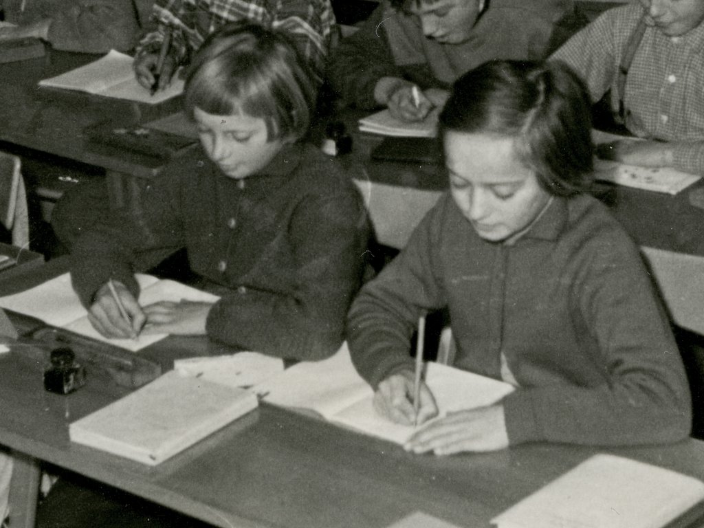 V prvih razredih osnovne šole smo imeli še vsi lesene puščice. Vsak je imel v torbici tudi stekleničko s tinto. Šolske klopi so imele pri vsakem učencu stekleno posodico – črnilnik, prav vtisnjeno v mizo. Pisali smo z lesenimi peresniki, na katere smo nataknili kovinsko pero. Pero smo pomakali v črnilnike na mizah oziroma lesenih klopeh, kot smo mize pogovorno imenovali. Preden smo odšli po končanem pouku domov, smo se na hodniku postavili v vrsto dva po dva. Učiteljica nam je rekla: “Za domovino!” Učenci pa smo skupaj zaklicali: