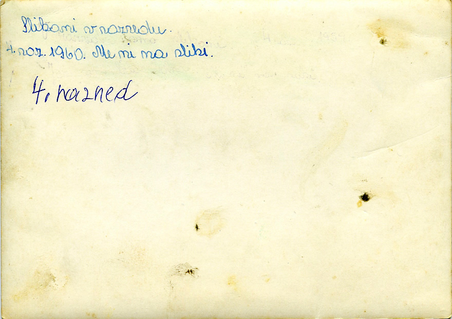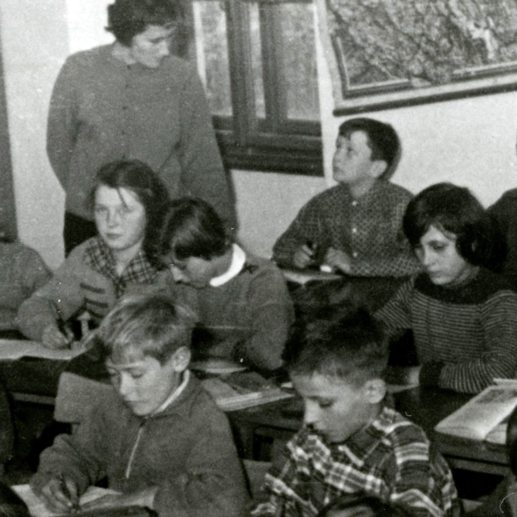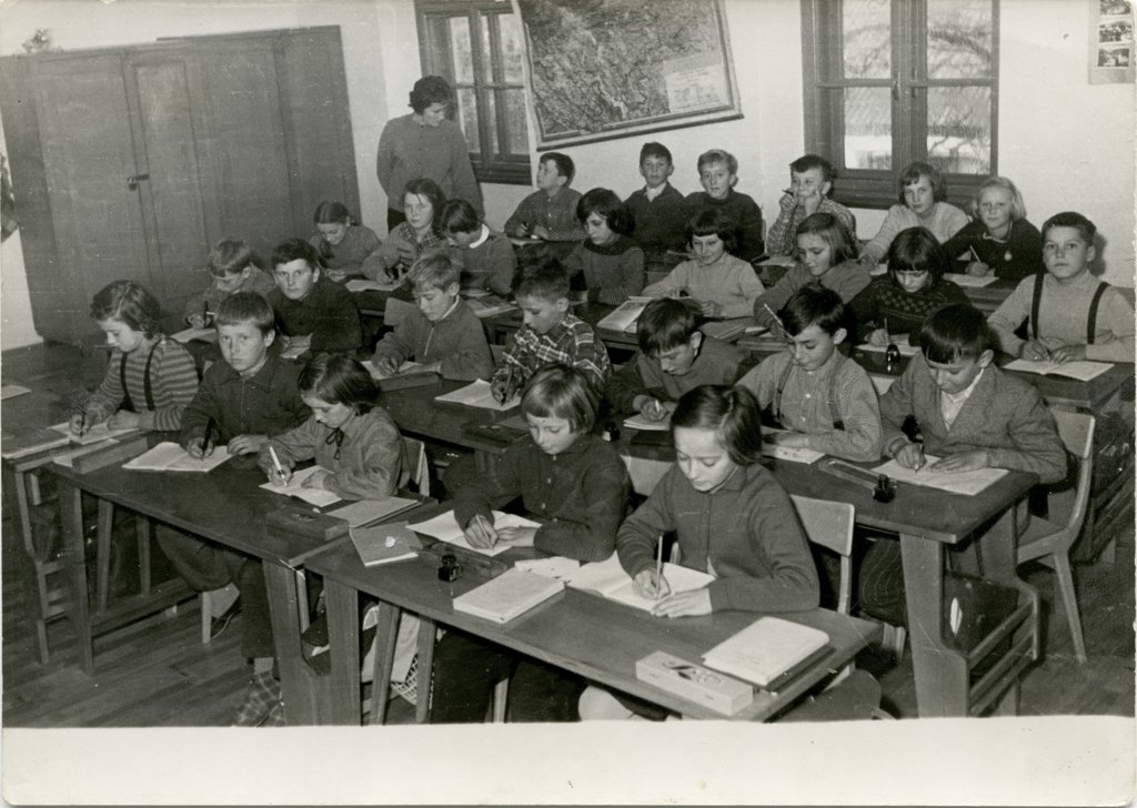Razredničarka Milka Kranjc, kasneje poročena Manfreda in njeni učenci slikani v 4. razredu osnovne šole. Bili smo zadnja generacija, ki je še obiskovala pouk v stari šoli na Veliki gasi, kjer je danes glasbena šola. Zadaj na steni vidimo velik reliefni zemljevid in veliko omaro, ki se je zaklepala s ključavnico, imenovano”žabca”.