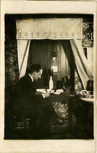 Slika prikazuje Alojza Tomca v svojem fotografskem ateljeju oziroma laboratoriju. Na zadnjo stran je natipkal s pisalnim strojem: