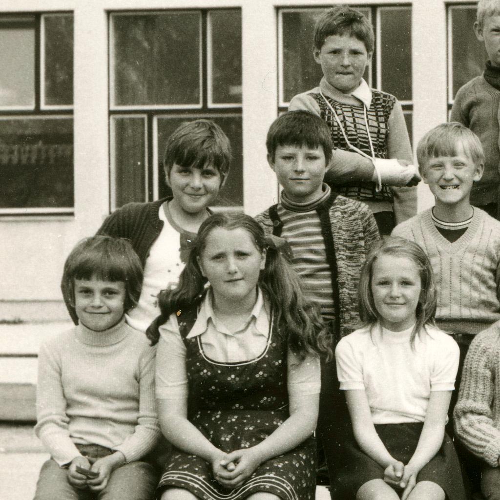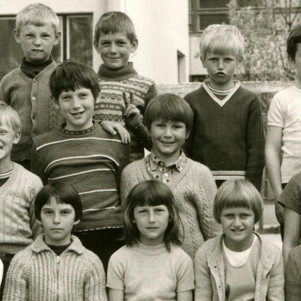 Le kaj se je zgodilo Romanu, da si je poškodoval desno roko? Je bil kriv nogomet ali morda celo pretep? V zadnji vrsti vidimo nasmejan obrazek, ki z užitkom kaže rožičke. In to ne kar nekomu, ampak najvišjemu sošolcu v razredu. Končno je enkrat nižji in sploh ne vidi, kaj se dogaja zadaj za njim. Kako dober občutek. Ker pa si vseeno ne želi povratnih ukrepov, pa naj bodo rožički kar na sredini med dvema. Tako lahko veljajo obema ali pa nobenemu. Prav tako sta zanimiva tudi njegova soseda s svojimi grimasami. Eden s prifrknjenim noskom in drugi s svojo šobico. To so še prisrčni, spontani odzivi, ki nastanejo pri skupinskem slikanju. Čista, neobremenjena otroška razigranost.