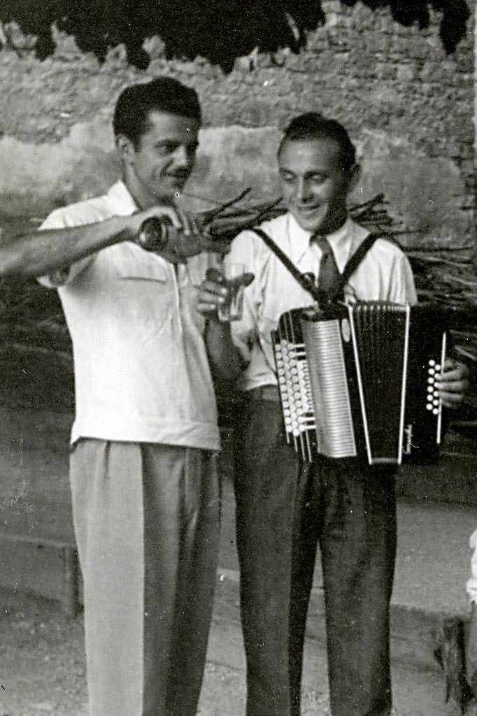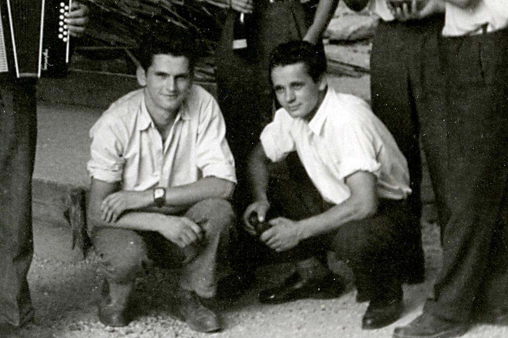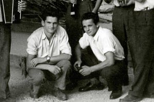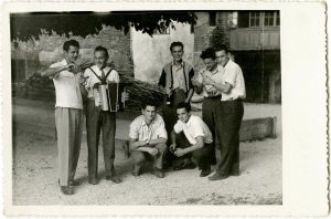 Leta 1957 so nastopili v Begunjah Avseniki, mislim, da je bilo to v mesecu avgustu, verjetno ob žegnanju. Tisto nedeljo je nastala tudi ta fotografija. Na sliki smo fantje dveh skupin. Eni so starejši in so že odslužili vojaški rok, drugi pa še nismo bili pri vojakih. V čem je problem? Dekleta, ki prej »dozorijo«, so zelo privlačne za fante, ki so že odslužili vojaški rok. Onih mlajših pa so se bale, kdo jih bo čakal dve leti. Zato so se izogibale kakšnih telesnih stikov. Če se je kakšna malo več upala in se pustila malo pobožati, si bil ves »blažen«. Tako ti ni ostalo nič drugega, kot da greš na veselico, pa še tam si se moral včasih zaradi grožnje umakniti pred 30-letniki.