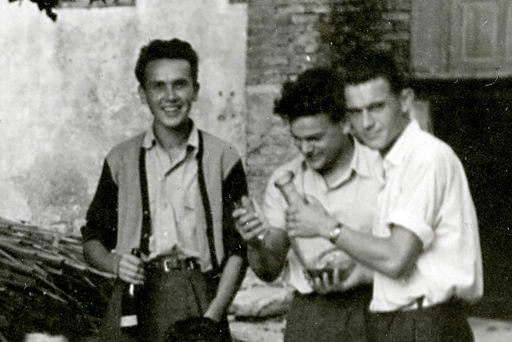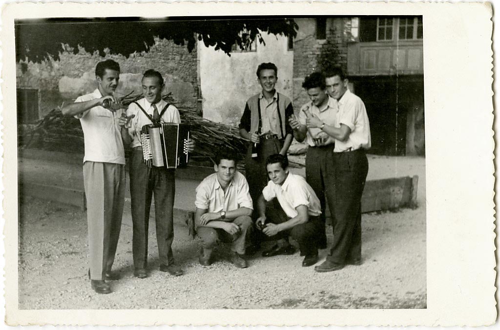 Fotografija veselih fantov je nastala na dvorišču Bonačeve gostilne v Begunjah avgusta 1956. Fantje stojijo v senci kostanja ob balin placu, ki je ograjen z deskami.