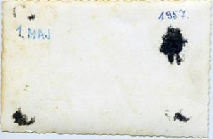 Slikano za 1. maj leta 1957. Natašini sorodniki, ki so prišli iz Ljubljane na prvomajski oddih in nekaj cerkniških prijateljev je preživelo lep dan ob druženju in igranju badmintona. Slikali so se ob velikem orehu na domačem dvorišču pri Nataši, zadaj za občinsko stavbo.
