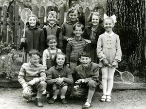 Na njihovem velikem dvorišču so se lahko otroci v miru, predvsem pa varno igrali, ker takrat še ni bilo veliko avtomobilov. Dvorišče je bilo idealno za igre, kot sta risntanc in zemljo krast. Pa tudi za badminton je bilo dovolj prostora. Ob Nataši čepi bratranec Aljoša iz Ljubljane in za njim je njegova sestrica Tatjana. Levo čepi Bojan, še en Natašin bratranec in prav tako Ljubljančan. Pri njem je Nataša nekaj časa stanovala, ko je obiskovala srednjo šolo v Ljubljani. Ostali otroci so domačini. Sestri Zdenka in Ladi, ter Venka so iz Velike gase, Milka je iz hiše ob Cerkniški pekariji pri Gorjupu, Vili in Sanda pa sta bila Natašina soseda.