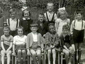 Prvi razred osnovne šole sem začel obiskovati septembra 1953. Pouk se je odvijal takrat še v Gabrenjevi hiši na železniški postaji. Pozneje je tu delovala glasbena šola. Za praznik republike 29. 11. 1953 je bila svečano odprta obnovljena šola. V spomin se mi je vtisnil takratni govornik, naš sosed železničar Alojz Wimmer v dolgi železničarski suknji. Na proslavi, ki je sledila, je bil svečan sprejem učencev prvega razreda, torej nas na sliki v pionirsko organizacijo. V spominu imam tudi, da je bila učiteljica Franja za vse nas kot druga mama.