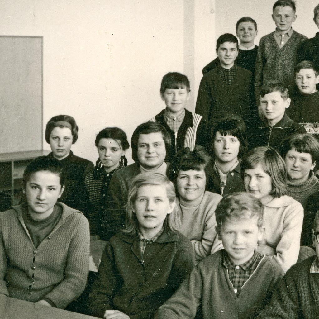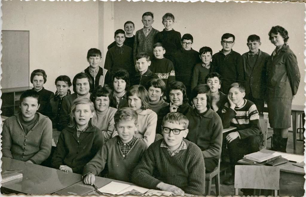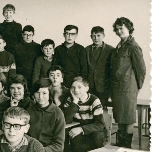 Učenci 6.c razreda so v šolskem letu 1964/65 vsi ponosni pozirali kar v razredu nove osnovne šole v Cerknici. Z njimi je razredničarka Marija Lavrenčič, ki je poučevala matematiko. Slikanih je 11 deklet in 15 fantov.