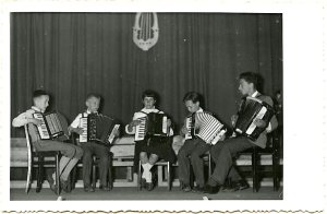 Glasbena šola je imela manjši »orkester« harmonik. Slika je z nastopa na osrednji proslavi 28. 11. 1959 v Kulturnem domu na Rakeku.