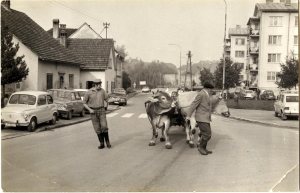 Tone vleče vola proti svoji hiši, tako, da bo voz lahko peljal mimo parkiranih avtomobilov.