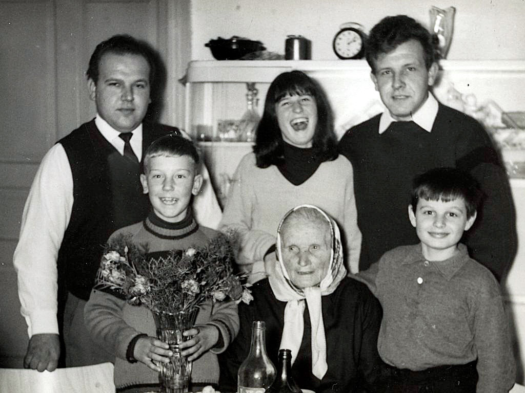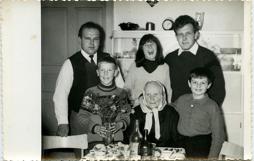 Mama se je na praznovanju slikala tudi s svojimi vnuki. Na sliki nismo vsi, saj na njej manjkajo štirje najstarejši vnuki, otroci njenega najstarejšega sina Franceta. Med nami je bila velika razlika, saj je bila moja najmlajša manjkajoča sestrična od mene starejša za skoraj 35 let. Manjkal pa ni pušeljc, niti neuničljivi stol Sardan, da o jedači in pijači ne govorimo.