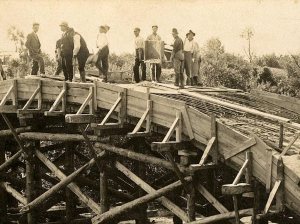 Ko so naložili in znosili vso mešanico, je nekdo odvrgel lopato, odložil zalivalko, s katero je prej škropil zmes peska in cementa, medtem ko sta ga najmanj dva premetavala, da je postal ravno prav moker in enakomerno zmešan, ter se lotil drugega dela. Je pohitel gor na vrh mostu, da bi bil zanesljivo na sliki? Le koliko ekip je moralo delati, da so zabetonirali most v enem dnevu? Ali so delali po etapah? Vsaj z vodo niso imeli težav, zajemali so jo iz struge in je ni bilo treba voziti v sodih na gradbišče, kot smo to delali še v sedemdesetih letih. Gradijo poleti, ko je vodostaj najnižji in glede gradbenega lesa so si najbrž pomagali z bližnjo Belmalensko žago – če ne, so šli ponj nekaj korakov višje ob bregu, k Špetnaku.
