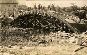 Tu so delavci postavili prav umetniške fršolnge za veliki lok, ki bo nosil nov, moderen most preko Obrha, precej višji od tistega malega kamnitega le petdeset metrov stran. Tudi že betonirajo. S tragami nosijo beton in ga stresajo na armirani opaž, beton pa ročno mešajo na praznem prostoru prav v ospredju slike.