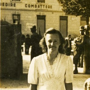 V ozadju se vidi stavba današnje knjižnice, takrat je bila tu hranilnica, na kateri se vidi napis v italijanskem jeziku. Med vrati v cerkveno obzidje stojita dva italijanska vojaka in en karabinjer. Tudi značilna lipca na placu pred taborom je lepo vidna in je na istem mestu kot danes.