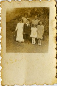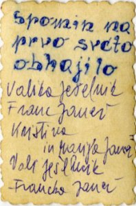 Ivančav Lojze (Alojz Miklič) iz Starega Kota je imel po vojni fotoaparat, ki ga je pred slikanjem prekril s črnim pregrinjalom. Ta sličica je produkt tega aparata, otroci in mamici so mu bili za posnetek zelo hvaležni. Ostal je spomin na povojne čase, ko se je bilo treba zelo potruditi, če so hoteli otroci opraviti ta sveti zakrament. Lojze jih je slikal nedaleč stran od njegovega doma na Pavličkovem vrtu pred hišo Valerije in Ludvika Ješelnika.