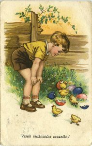 Sem malo zašla, grem takoj nazaj. Torej: surova jajca skuhamo, pobarvamo. Hec pa je, kot je videti na razglednici, ko se iz teh pobarvanih jajc zvalijo piščančki. Glih za tolk neumne nas pa res ni treba imet, ker če ne drugega – ni lepo.