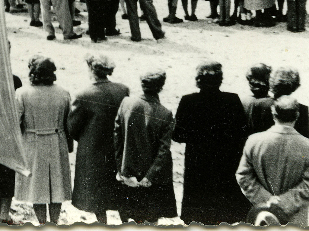 Verjetno je sijalo sonce, ker se je gospod odkril. Bilo mu je vroče. Ženske so oblečene v plašče iz lažjega blaga, kakršnega je imela tudi mama. Rjav je bil, z velikim ovratnikom.Slovarček: