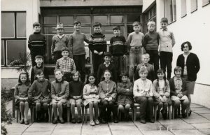 Milka Manfreda je bila razredničarka 4. b razreda v šolskem letu 1966/67. Z njo se je slikalo 22 učencev od tega 10 fantov in 12 deklet. Na sliki izstopa med fanti Miran s svojim klobučkom. Ko ga je pač dobil, je postal njegov zaščitni znak. Miran pove, da ga je nosil vedno in povsod. Saj je dobesedno rasel z njim, vse dokler ni razpadel. Jezerski Kekec?