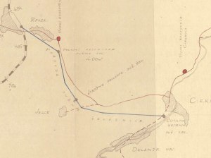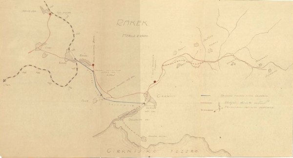 Na malo slabše vidnem zemljevidu je narisan potek vodovoda od zajetja proti Rakeku. Nad cesto Cerknica — Begunje nad Krajcovo žago je narisan vodni rezervoar.- Cirknica – Cerknica
