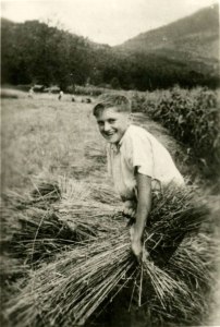 No, čas nastanka obeh slik v tem prispevku je ocenjen na okoli leta 1960 in prva je nastala verjetno nekje okoli Vrhnike, če je pobočje zadaj del Racne gore. Kdo je sliki posnel, ne vemo, tudi ime mladega žanjca, ki se je tako korajžno nasmejal v aparat, je neznano. Toda žito, ki ga ima v rokah, se zdi dovolj dolgo, da bi ga mogoče uporabili za izdelavo škope in zato lahko tukaj pritaknem naslednji zapis: