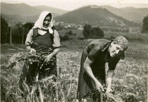 Ta slika je bila posneta nekje v okolici Loža, najverjetneje pod Ulako, saj se zadaj vidi Loški hrib z gradom, pod njim pa lipov drevored, od katerega sta do zdaj ostali le še lipa ali dve, Kovinoplastike pa na tej sliki še zdaleč ni. Kdo sta žanjici, ki žanjeta (najverjetneje) ječmen, ne vemo, kljub temu da sta obraza razločna. Zadaj se vidi njiva cvetočega krompirja in lep kos strnišča, na hrbtu žanjice na desni pa potni madež, kajti žetev, ki mora biti opravljena ravno pravi čas v suhem in toplem vremenu, res ni lahko delo. Zanimivi sta njuni kambrikasti ruti: žanjica na levi je svetlo ruto obdržala rahlo zavezano neskriš pod brado in nekoliko potegnjeno naprej na šišco, da ji senči oči, ko se skloni. Druga je pokrita na marinko – veter ji tako ne razpihava las na obraz, ruta pa vpija potne srage na čelu in hladi glavo. Izpod rute ji kuka uho, za katerega se zdi, da je na njem pripet uhan, mogoče zlat murček … Rokave na obleki si je visoko spodvihala, da je hladneje … Le kdaj sta začeli – zgodaj, takoj ko je šla rosa dol? Še prej? Pozneje? … Nekje sem že napisala, da se kot žanjica nisem proslavila in tako tudi ne vem, ob kateri uri dneva je najbolj pametno začeti žeti. Tisto nekajkrat, ko sem bila jaz zraven, smo želi popoldne, a to najbrž ni pravilo, vem pa tudi, da so bile pri preveč zrelem žitu preglavice z osipanjem zrnja … Slame tega žita na sliki pa ne bodo uporabili za škupo – prekratko je in tudi precej plevela je videti vmes.