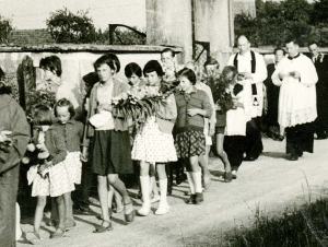 Deklice in dekleta so nosile šopke rož. V ozadju domači duhovnik Vojko Seljak.