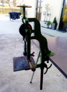 Na levi strani ponka je bil ta ročni vrtalni stroj, ki ga je prinesel Janez Mramor. Verjetno ga je sam izdelal in je bil v tovarni edini stroj za vrtanje.