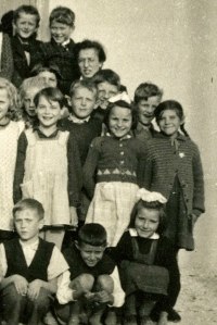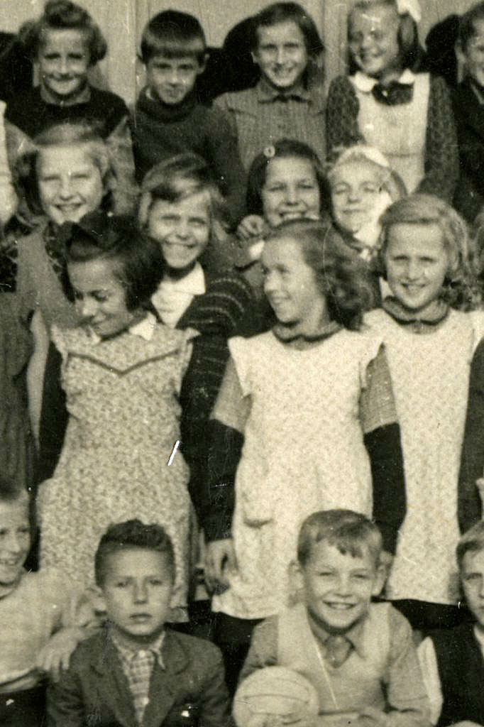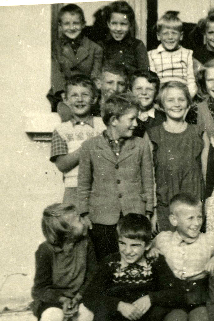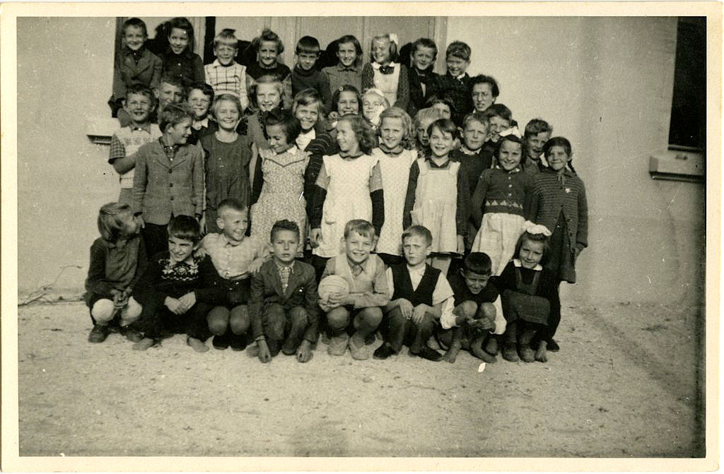Slika je nastala pred staro osnovno šolo leta 1955 ali 1956. Skupaj so se slikali učenci dveh razredov, verjetno tretjega in četrtega razreda.