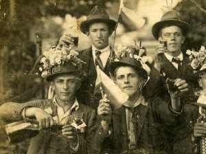 O naborih, štelngah je bilo v starih slikah že veliko napisanega. Takole veselo ter primerno za tak dogodek pa so se naborniki letnik 1905 z Rakeka postavili, posedli pred fotografskega mojstra Ivana Tišlerja potem, ko so bili potrjeni, da so sposobni za vojaški stan. Nabor je bil okoli leta 1924. Okrašeni s šopki cvetja, ki so si jih ponosno zatikali za klobuke ali pripenjali na obleko so proslavljali ta dan. Po njihovem videzu se vidi, da je moralo biti jako naporno. Koncentracija je popustila, kravate so šle svojo pot, maligani so opravili svoje. Po blatnih čevljih in hlačah pa tudi, da so dogodek proslavili kljub verjetno slabemu vremenu z veseljačenjem in plesom. Sredi skupine je godec Ivan Štrukelj vsem znani kot »Rajcov Ivan«